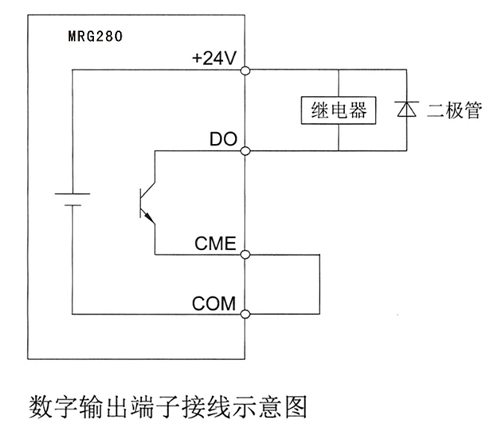注2:數(shù)字輸出地CME與數(shù)字輸入地COM是內(nèi)部隔離的,但出廠時(shí)CME與COM已經(jīng)外部短接(此時(shí)D01默認(rèn)為+24V驅(qū)動(dòng))。當(dāng)D01想用外部電源驅(qū)動(dòng)時(shí),必須斷開(kāi)CME與COM的外部短接。